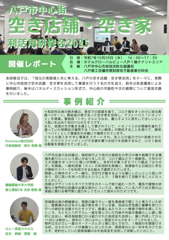 引用元:株式会社まちづくり八戸 公式webページ_お知らせ【八戸市中心街空き店舗・空き家利活用研修会2025を開催いたしました。】