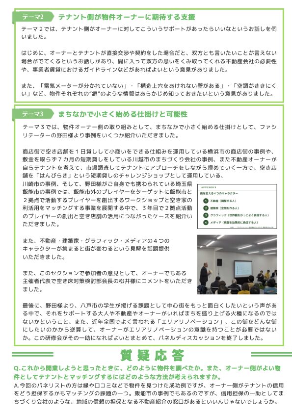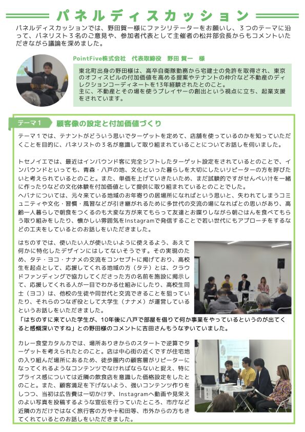 この度、八戸市中心市街地活性化協議会と八戸商工会議所理財部会不動産分科会との共催で「八戸市中心街空き店舗・空き家利活用研修会2025」にて、弊社代表 野田がファシリテーターとして登壇いたしました。